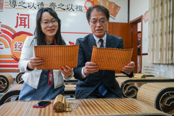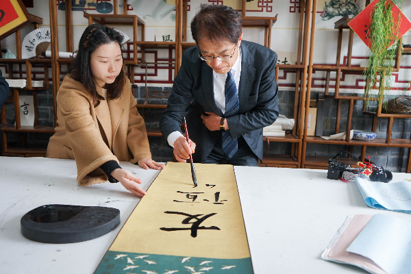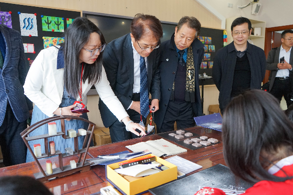松井三平先生一行首先参观了小言子学堂,学着小言子的样子席地而坐,饶有兴致地拿起竹简书,用中文朗读《三字经》;接着在元音馆内,学说偒傣话,动手做香包,小朋友们还把制作好的香包香囊送给日本客人。此外,一行还参观了升旗仪式、大课间活动以及篆刻、彩泥、击剑、朗读者等多个儒香课程,松井三平先生还在书法教室挥笔写下了“友谊第一”的美好心声。